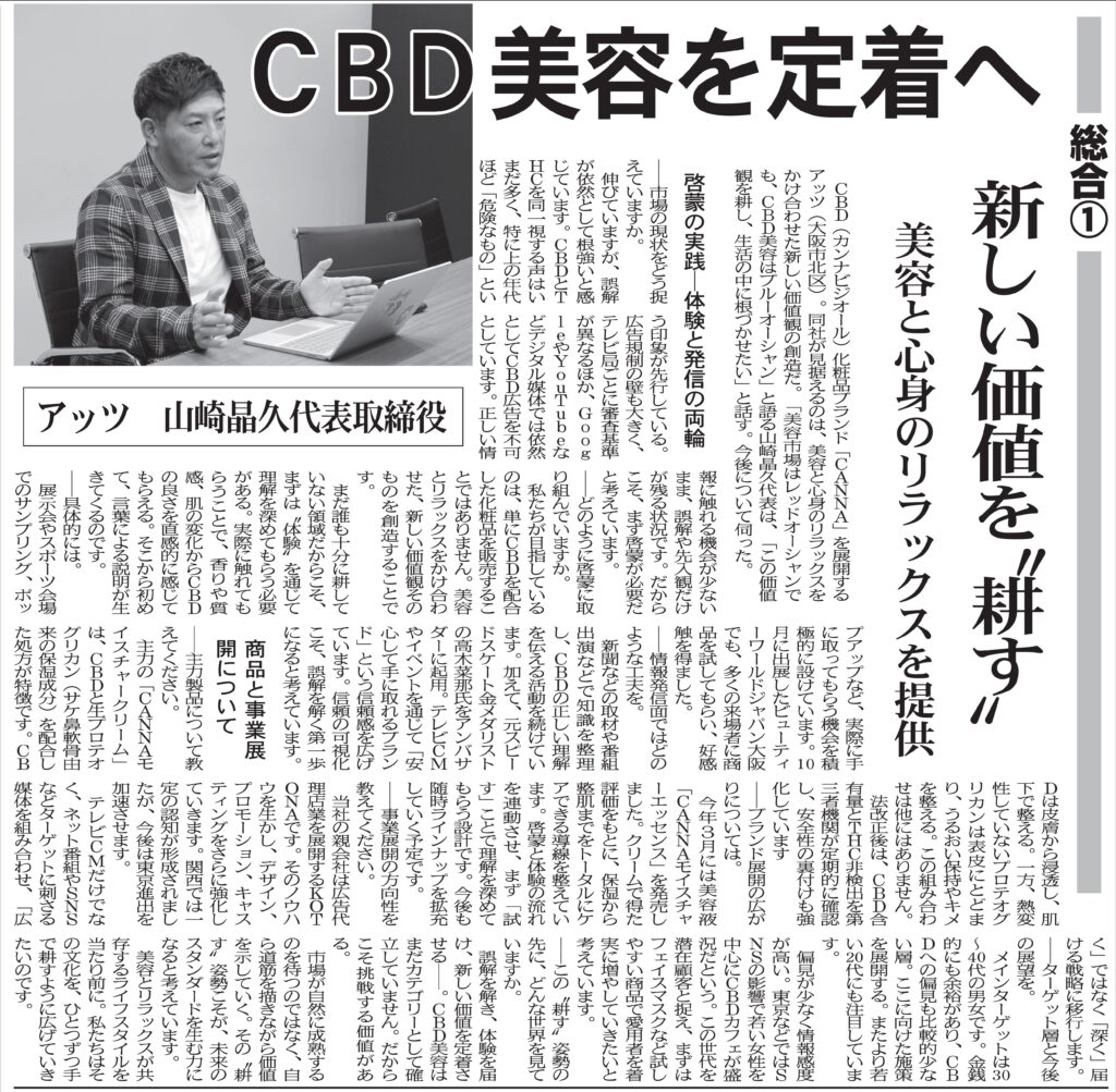 健康産業流通新聞に、グループ会社 株式会社アッツ 代表取締役・山崎晶久のインタビュー記事が掲載されました。 2025年12月2日 最終更新日時 : 2025年12月2日 atts_kot0na_2022 健康産業流通新聞に、弊社代表取締役・山崎晶久のインタビュー記事が掲載されました。 記事では、CBDを活用した美容分野での取り組みや、今後の事業展開について紹介されています。ぜひご覧ください。